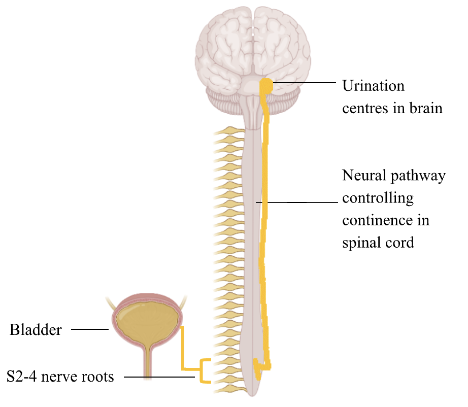 This everyday action is an interplay between the brain, spinal cord, motor and sensory nerves (mostly from the lower nerve roots) and bladder (Figure 1). Therefore, injury to any of these pathways can cause incontinence. The spinal nerves as low as the sacrum level (S2-4) are involved in continence. A common memory aid used in medical school to remember this is “S2-4 keeps waste products off the floor”. Therefore, any disruption between the brain and this level (ie most of the spinal cord) may cause incontinence.